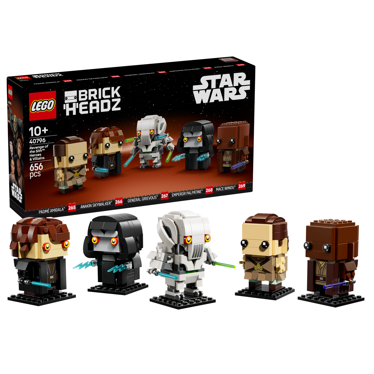 - 5 LEGO® Star Wars™ BrickHeadz™ Revenge of the Sith™ buildable figures – Anakin Skywalker, Padmé Amidala, General Grievous, Mace Windu and Emperor Palpatine with authentic accessories