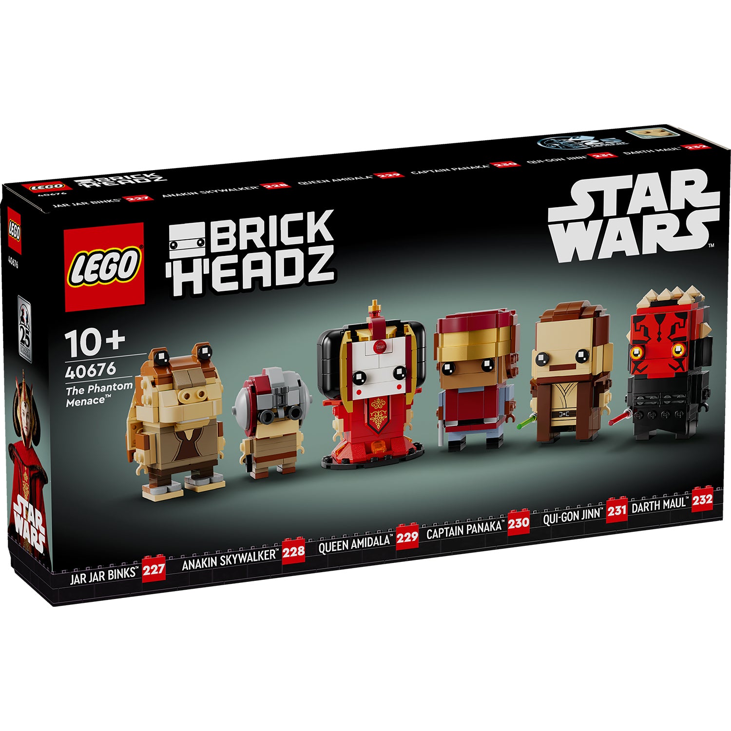 Celebrate the 25th anniversary of Star Wars: The Phantom Menace and LEGO® Star Wars™ building sets with this build-and-display set of 6 collectible LEGO BrickHeadz™ figures (40676). A cool anytime gift for Star Wars fans, it features brick-built LEGO figures of Jar Jar Binks, Anakin Skywalker, Queen Amidala, Captain Panaka, Qui-Gon Jinn and Darth Maul, each with baseplates, plus authentic accessories such as young Anakin’s hammer and Darth Maul’s red double-bladed lightsaber.