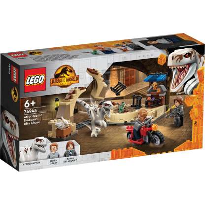 Fans can recapture the excitement of the Jurassic World: Dominion movie with this Atrociraptor Dinosaur: Bike Chase (76945) building set. An ideal gift for kids aged 6 and up who deserve a treat, this playset features a posable Atrociraptor toy figure, motorcycle, and a brick-built market with an easy-to-reset collapsible wall and rotating dinosaur fighting pit.