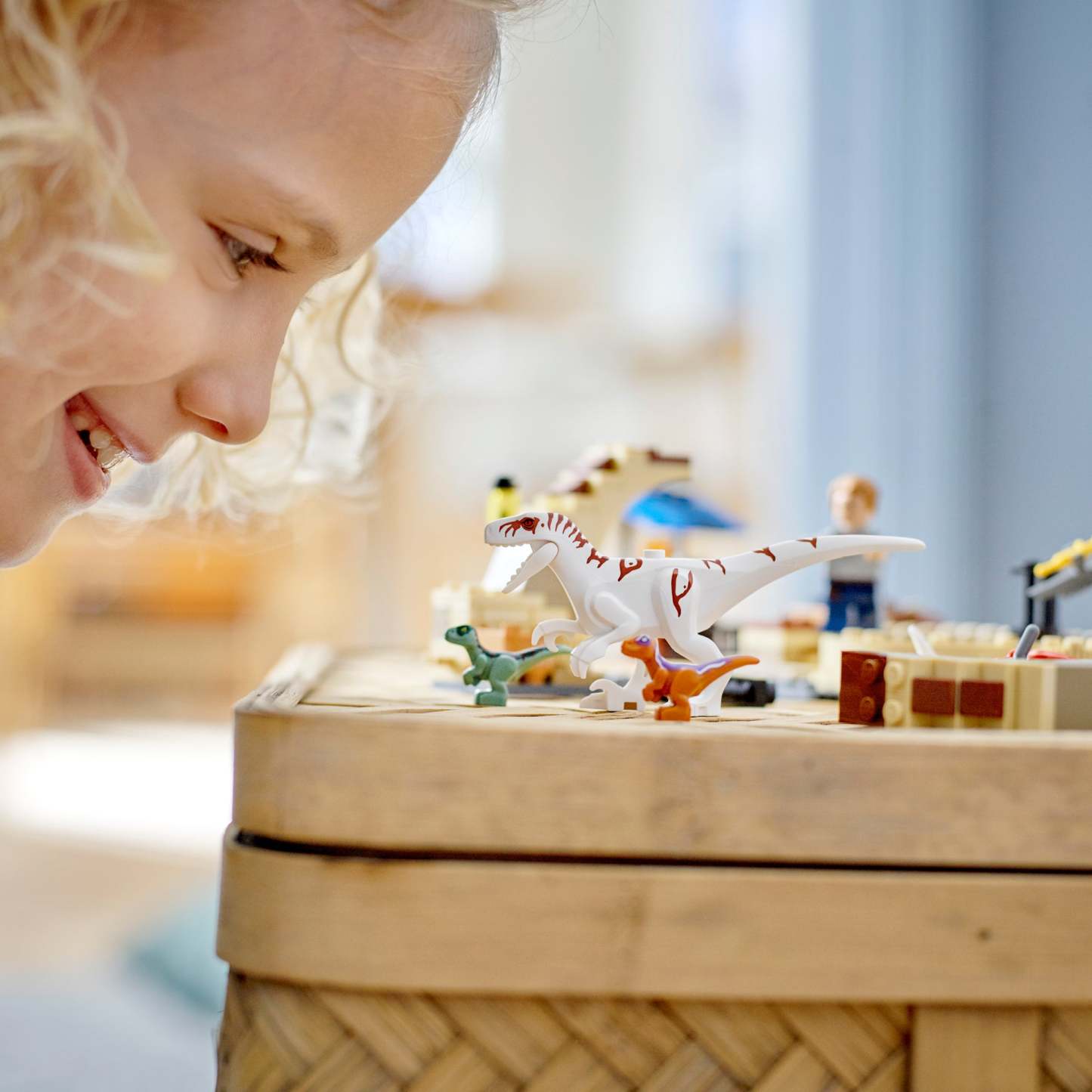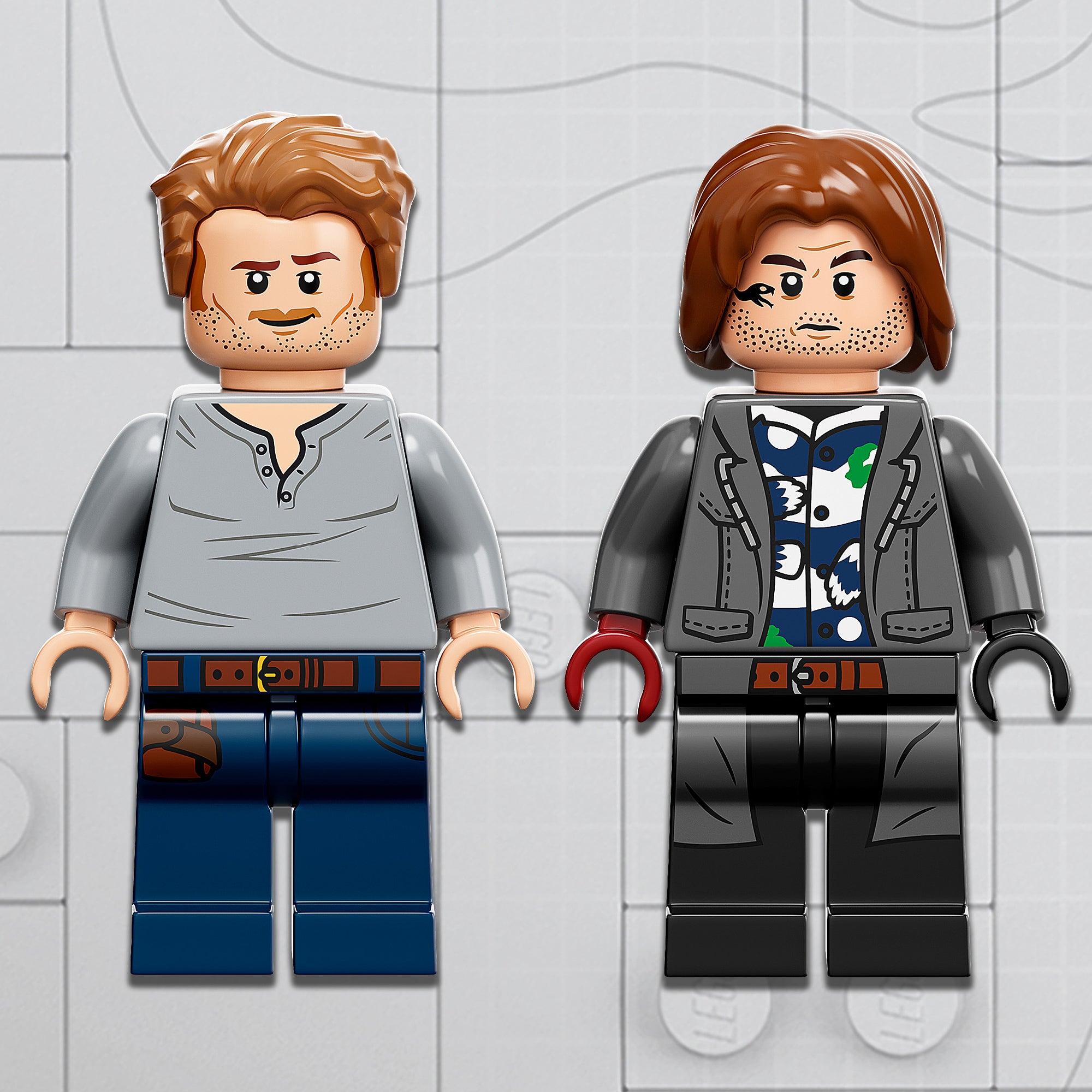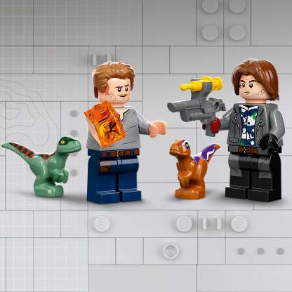 - 2 LEGO® minifigures and dinosaurs – Owen Grady and Rainn Delacourt with a tranquilliser gun, plus a posable Atrociraptor figure and 2 small dinosaur toy figures for roleplay action