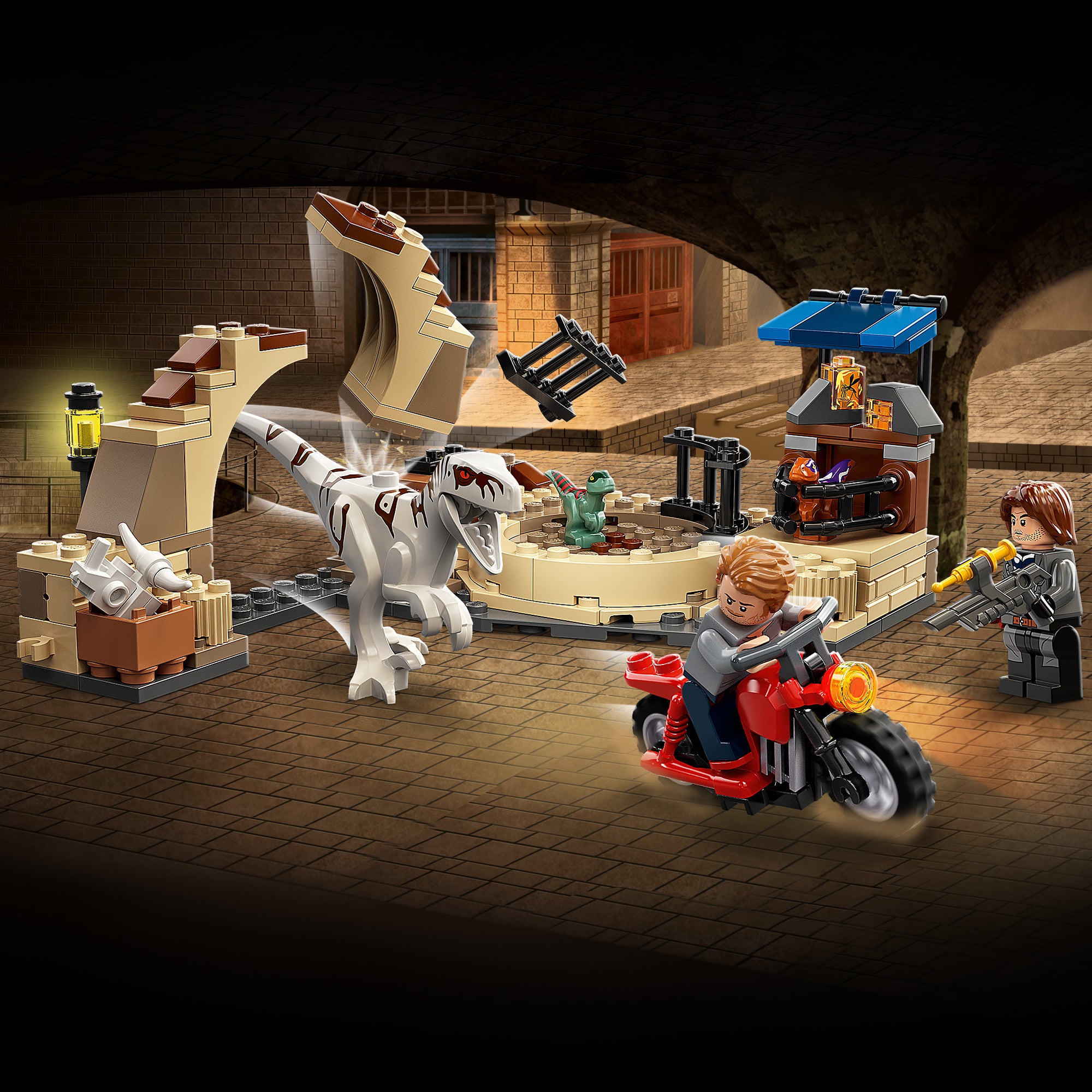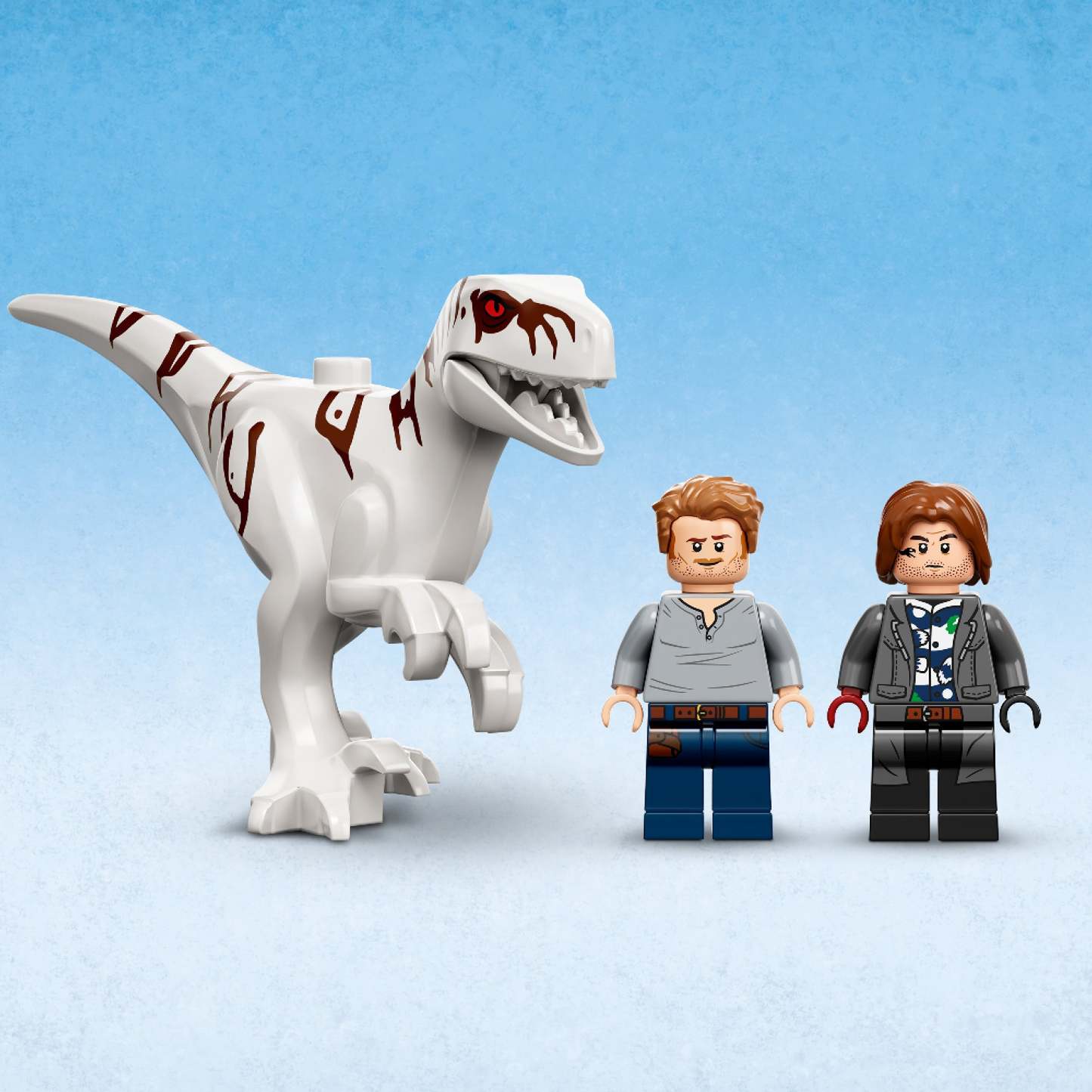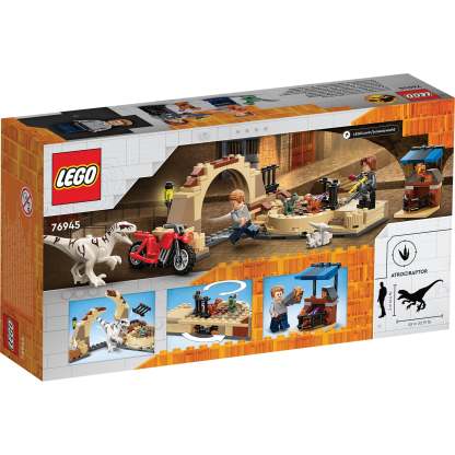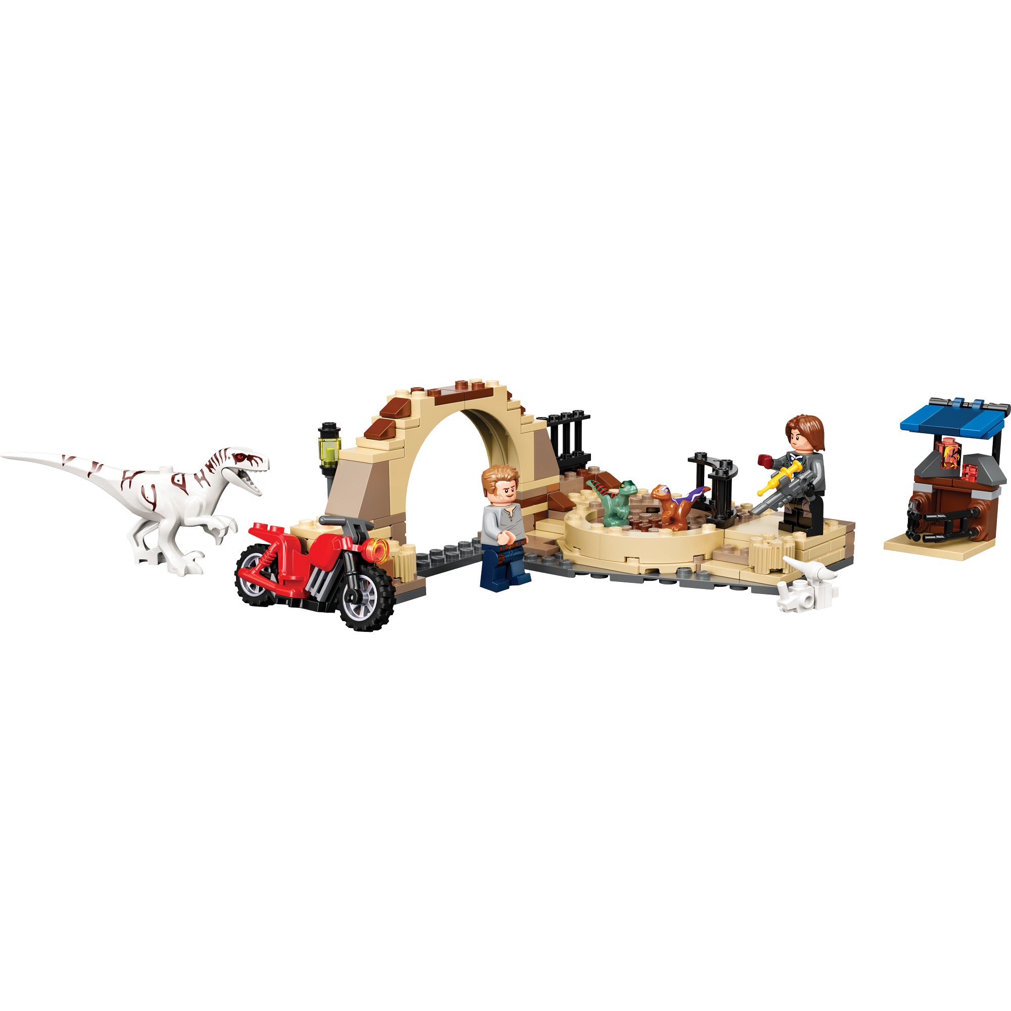 - 2 LEGO® minifigures and dinosaurs – Owen Grady and Rainn Delacourt with a tranquilliser gun, plus a posable Atrociraptor figure and 2 small dinosaur toy figures for roleplay action