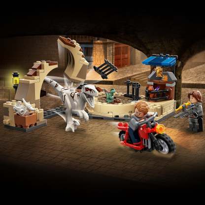 - Many play-inspiring features – A motorcycle for Owen, a buildable market with a collapsible wall for the Atrociraptor or motorcycle to smash through, and a rotating battle pit for the small dinosaurs