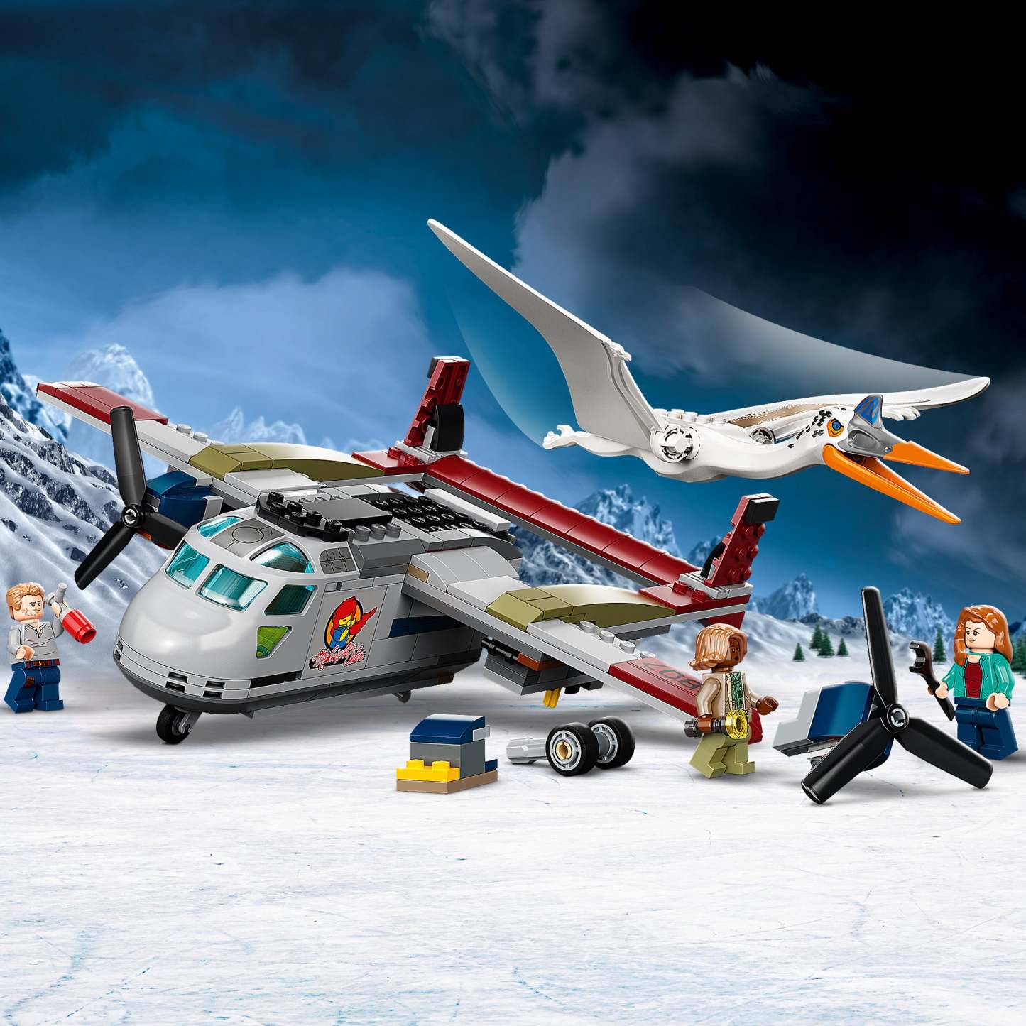 - 3 minifigures and a pterosaur toy figure – With Owen Grady, Claire Dearing and Kayla Watts minifigures. The Quetzalcoatlus measures over 11.5 in. (29 cm) wide and has posable wings and a snapping beak