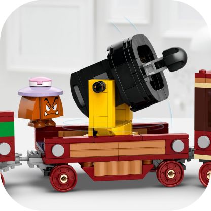 Add a LEGO® Mario™, LEGO® Luigi™ or LEGO® Peach™ figure (not included) for interactive play. Help them to chase the train in the handcar, operate the spinning platform on the locomotive and activate the cannon wagon’s spring-loaded shooter. Once all the enemies are defeated, trigger horn sounds as they drive Bowser’s Express to the station.