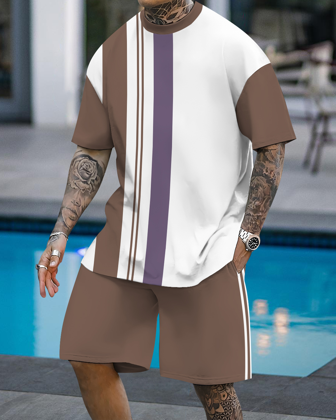 Men's fashion casual color matching printed short-sleeved two-piece set