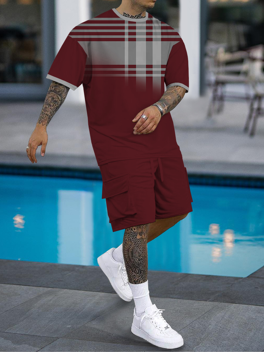 Men's fashion casual color matching printed short sleeve pocket shorts two-piece set